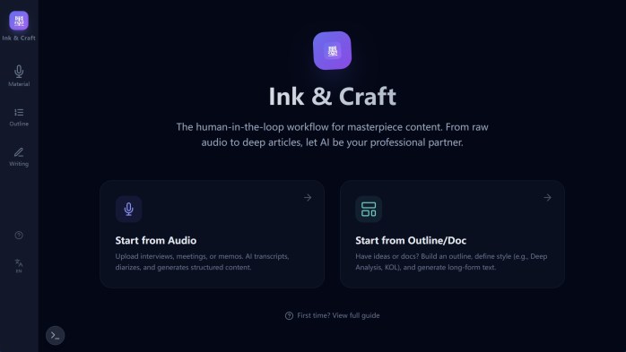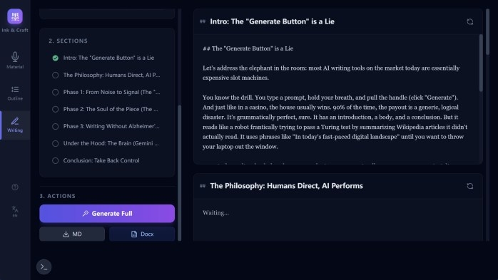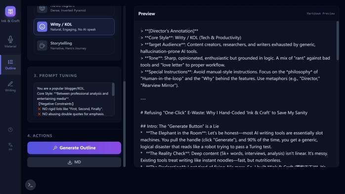 Human-in-the-loop, Crafted by Intelligence. > A professional AI workflow tool designed for long-form, deep content creation. Rejecting the mediocrity of “one-click generation,” it uses a professional pipeline of Material Parsing -> Outline Building -> Sectional Writing to let AI truly become your creative partner.